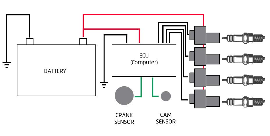 Um Ihnen zu veranschaulichen, wie Zündspulen in Ihrem Fahrzeug verdrahtet sind, finden Sie hier einen einfachen Schaltplan: