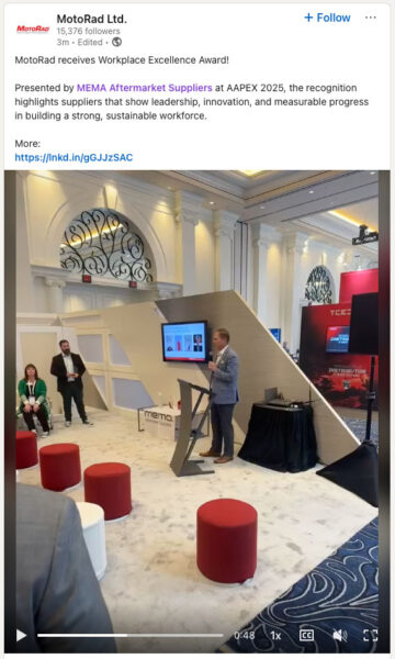 MEMA Aftermarket Suppliers presented the award on the AAPEX show floor in Las Vegas. MotoRad’s submission cited a clear people strategy, new recruiting pipelines, skills development programs, frontline engagement, and data-driven retention results across regions.